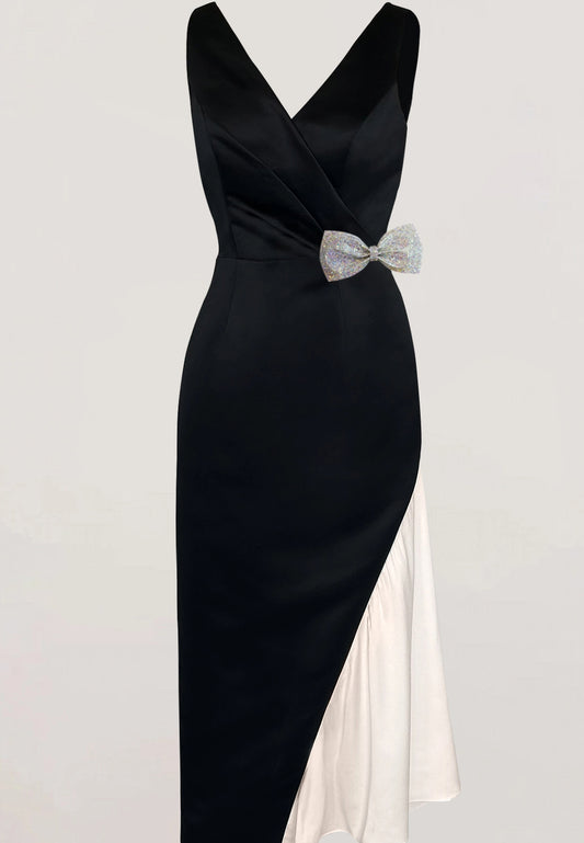 Elegant Black Satin Cocktail Dress Embellished Bow Midi Dress