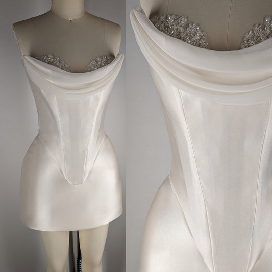 Cream Pearl White Duchess Satin Corset Draped Neckline Beaded Lace Crystal Embroidered Cups Mini Skirt Dress