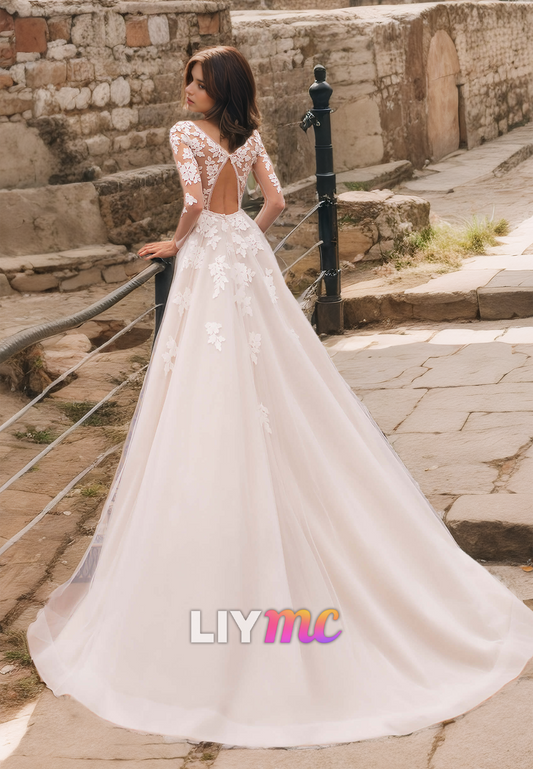 V-Neck Sheer Lace Appliques Long Sleeves A-Line Wedding Dress