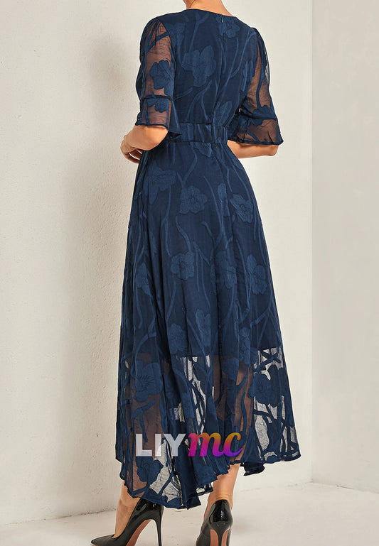 V-Neck Short Sleeves Appliques A-Line Midi Mother of Bride Dress