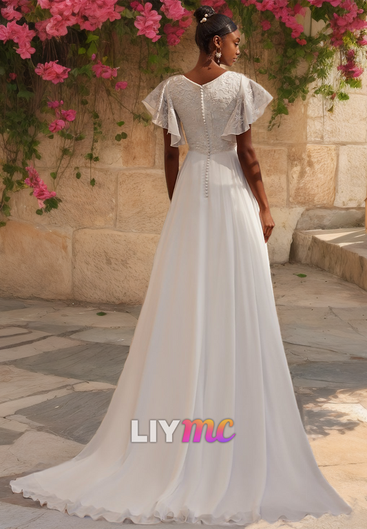V-Neck Sheer Appliques Sleeves High Slit A-Line Beach Wedding Dress
