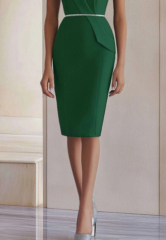 V-Neck Short Sleeves Beaded Sheath Knee-Length Work Dress