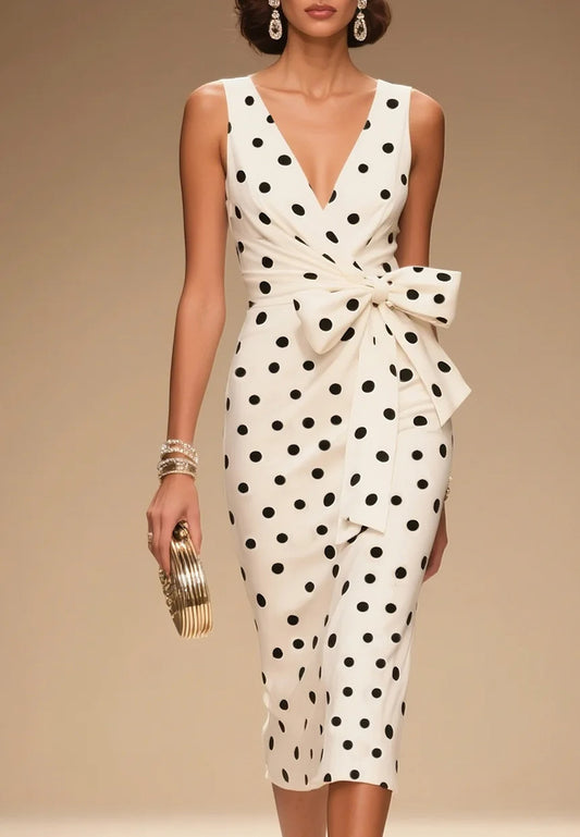 V-Neck Sleeveless Bowknot Polk Dot Sheath Work Dress
