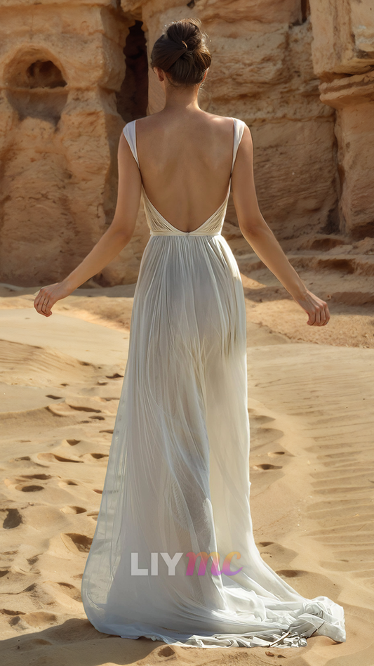 V-Neck Sleeveless Open Back Chiffon High Slit Beach Wedding Dress