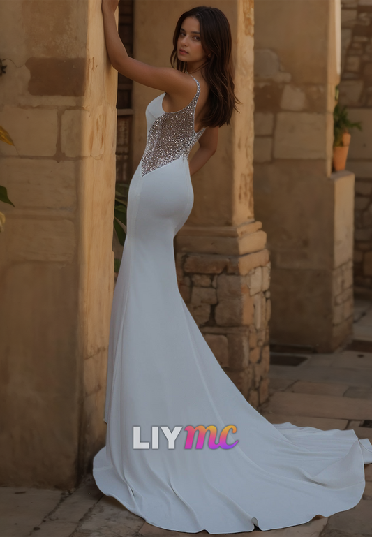 V-Neck Sleeveless Sleek Satin Beaded Mermaid Wedding Dress