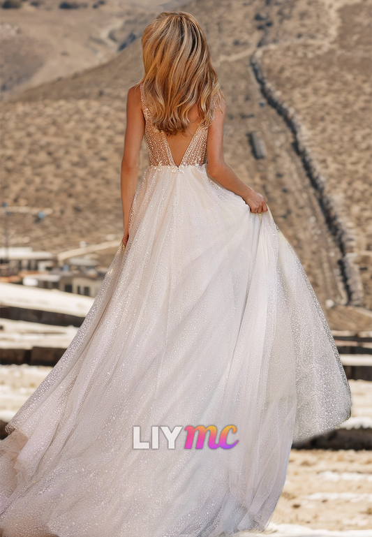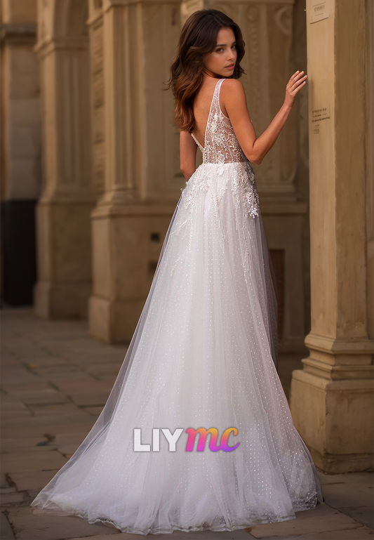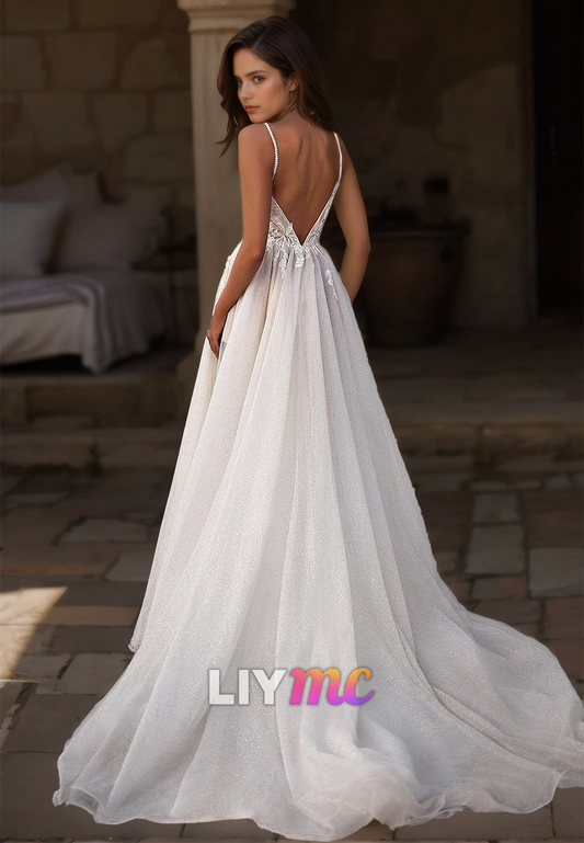 V-Neck Spaghetti Straps Appliques Tulle A-Line Beach Wedding Dress