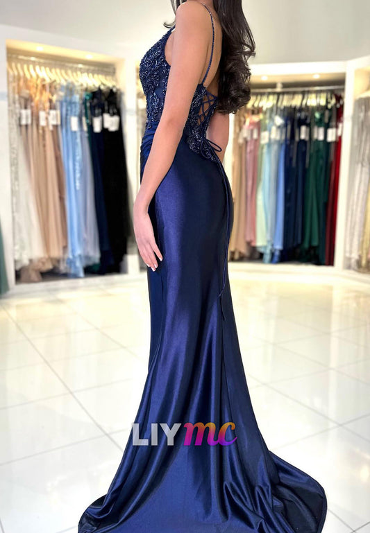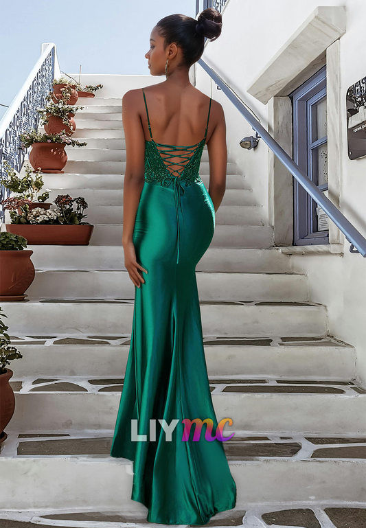 V-Neck Spaghetti Straps Appliques Side Slit Sheath Prom Dress