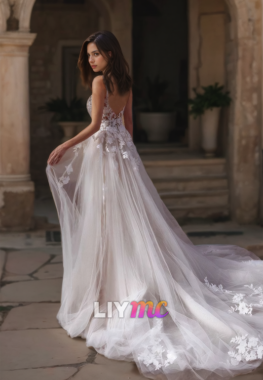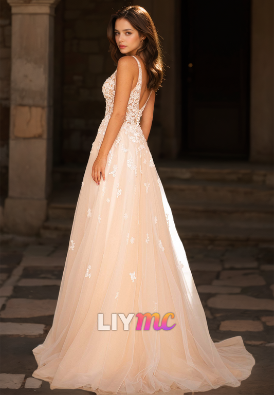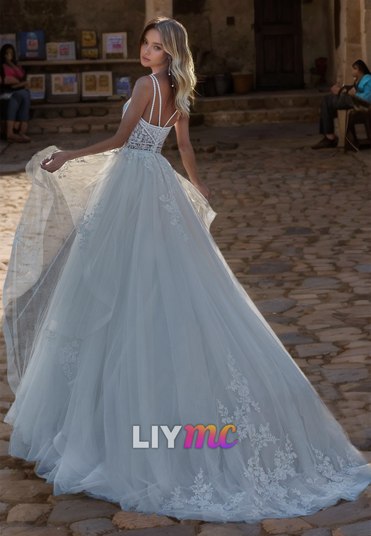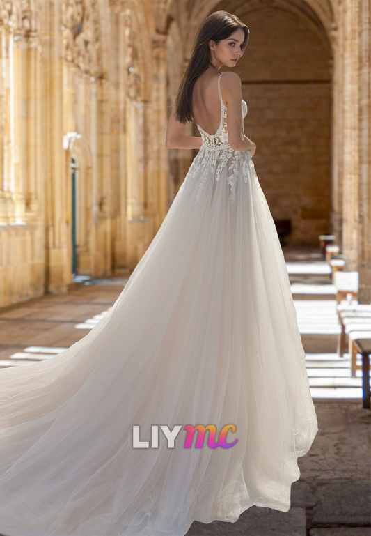 V-Neck Spaghetti Straps Appliques Tulle A-Line Wedding Dress