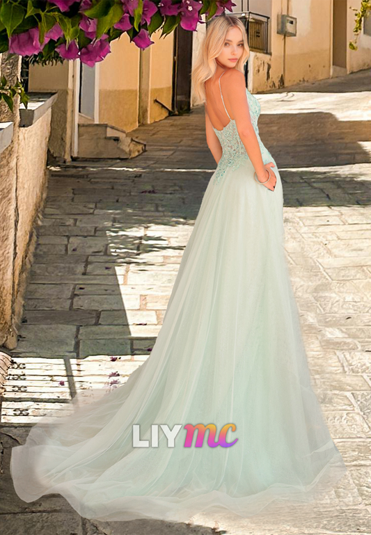 V-Neck Spaghetti Straps Appliques Tulle A-Line Prom Dress
