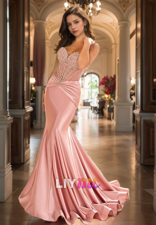V-Neck Spaghetti Straps Beaded Sleek Mermaid Prom Dress