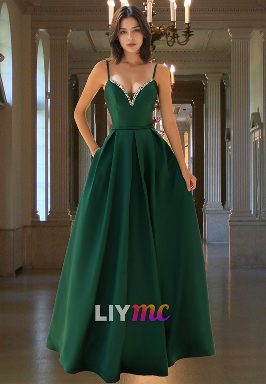 V-Neck Spaghetti Straps Beaded Pleated Satin A-Line Prom Dress
