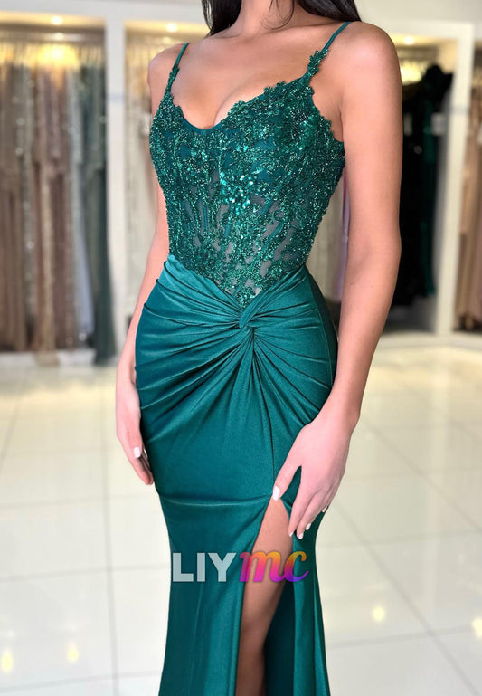 V-Neck Spaghetti Straps Appliques Pleated Side Slit Sheath Prom Dress