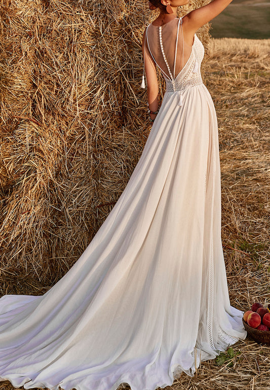 V-Neck Spaghetti Straps Appliques Tulle A-Line Boho Wedding Dress