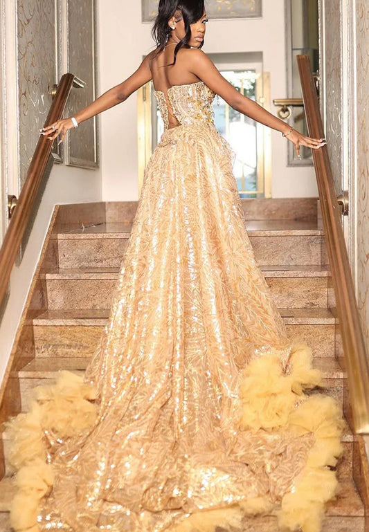 Gold V-Neck Strapless Beaded Side Slit Sparkly Sheath Prom Dress