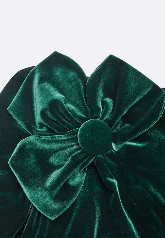 Green Bow Ruched Velvet Boat Neck Long Sleeve Sheath Midi Dress