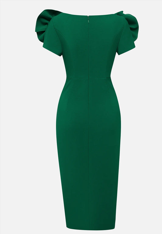 Green Cowl Neck Ruched Cap Sleeve Sheath Midi Dress