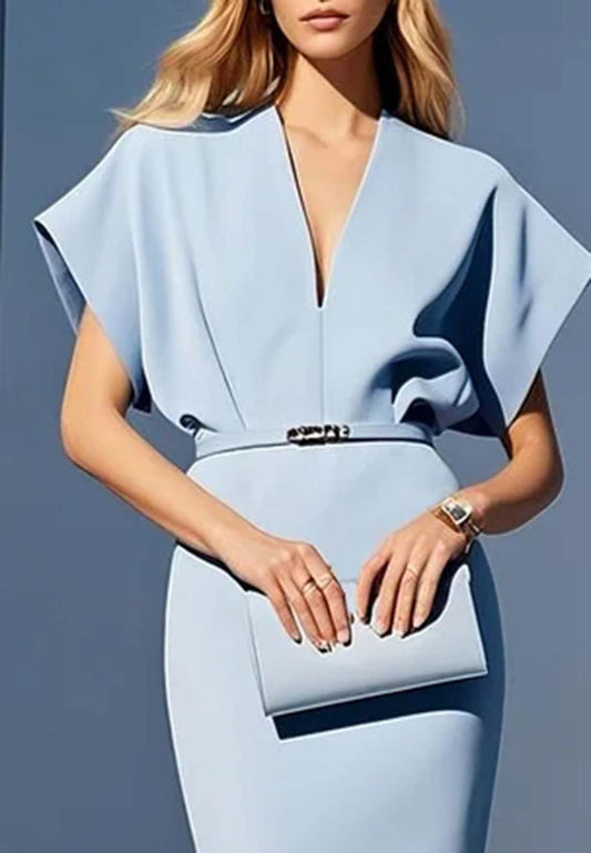 Light Blue Classic V Neck Short Sleeve Dolman Sleeve Sheath Midi Dress