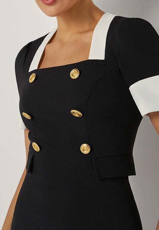 Black Buckle Blazer Square Neck Short Sleeve Sheath Midi Dress