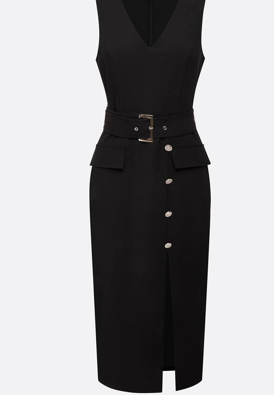 Black Buckle Slit Classic V Neck Sleeveless Sheath Midi Dress