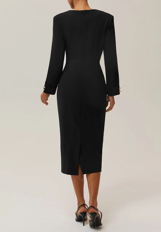 Black Buckle V Neck Long Sleeve Sheath Midi Blazer Dress