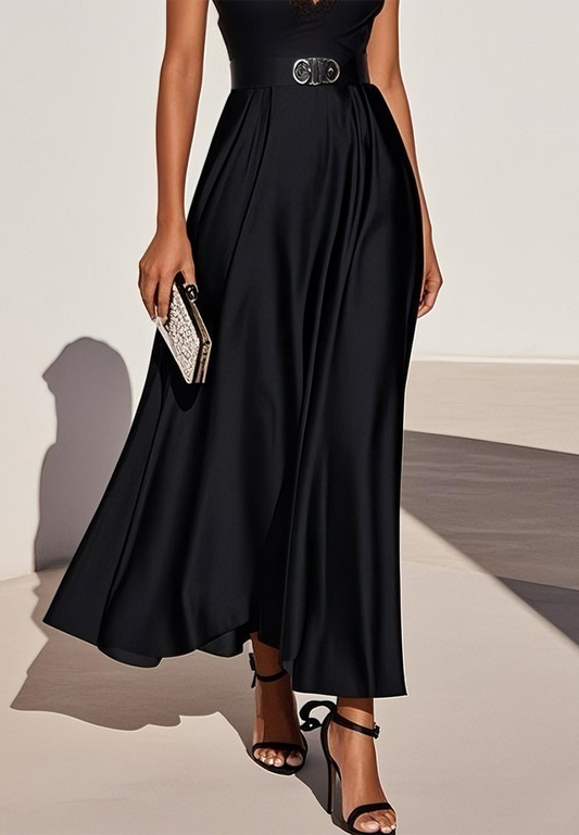 Black Buckle Notched Sleeveless A-Line Midi Dress