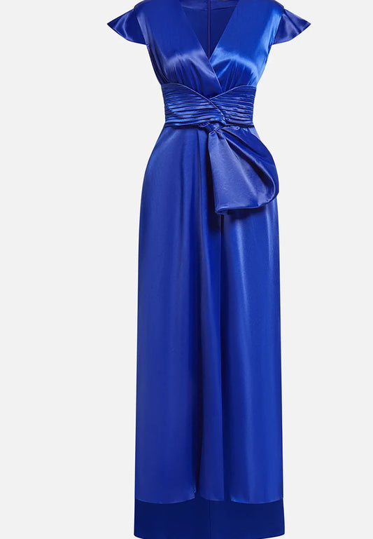 Blue Cap Sleeve Bow Satin A-Line Maxi Dress