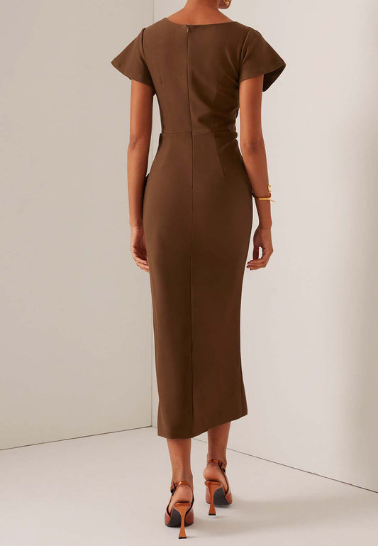 Brown Ruched Short Sleeve Sheath Midi Dress