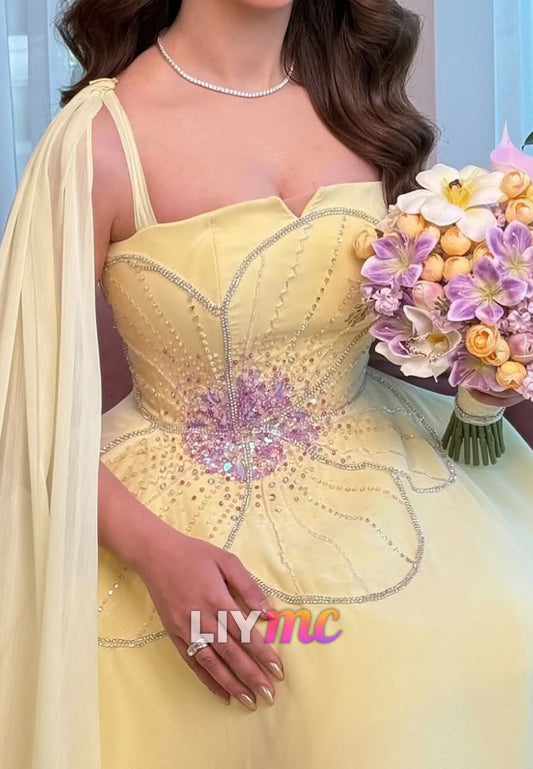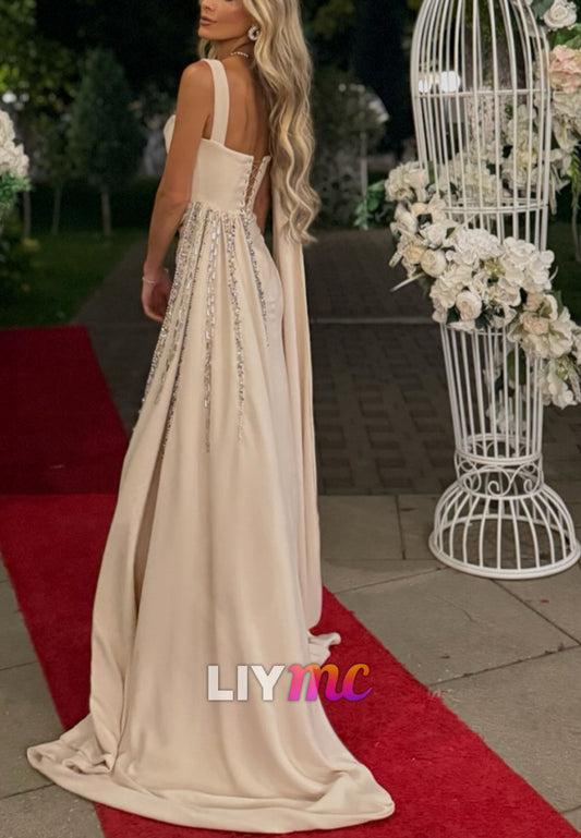 Square Spaghetti Straps Beaded A-Line Evening Dress