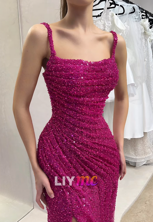 V-Neck Spaghetti Straps Side Slit Sparkly Sheath Prom Dress