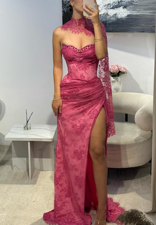 V-Neck Strapless Ruched Side Slit Sheath Prom Dress