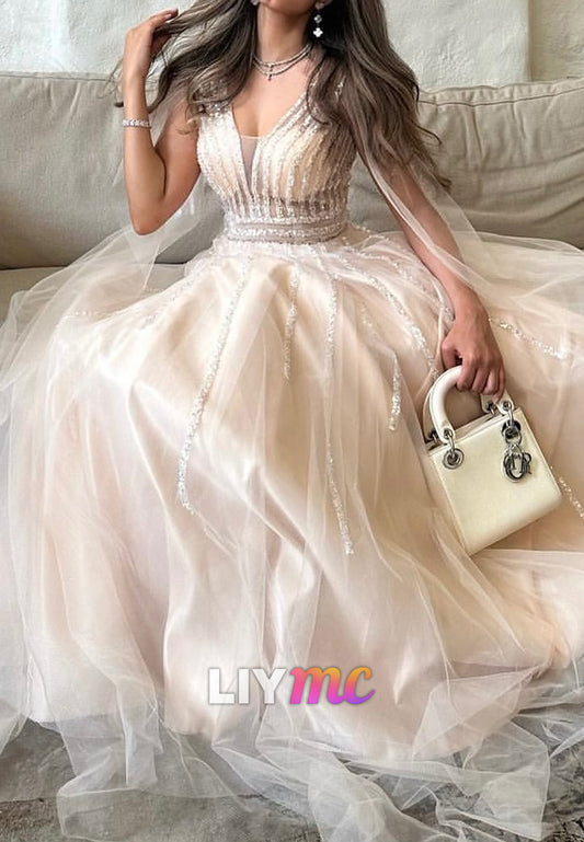 V-Neck Long Sleeves Beaded Embroidery A-Line Evening Dress