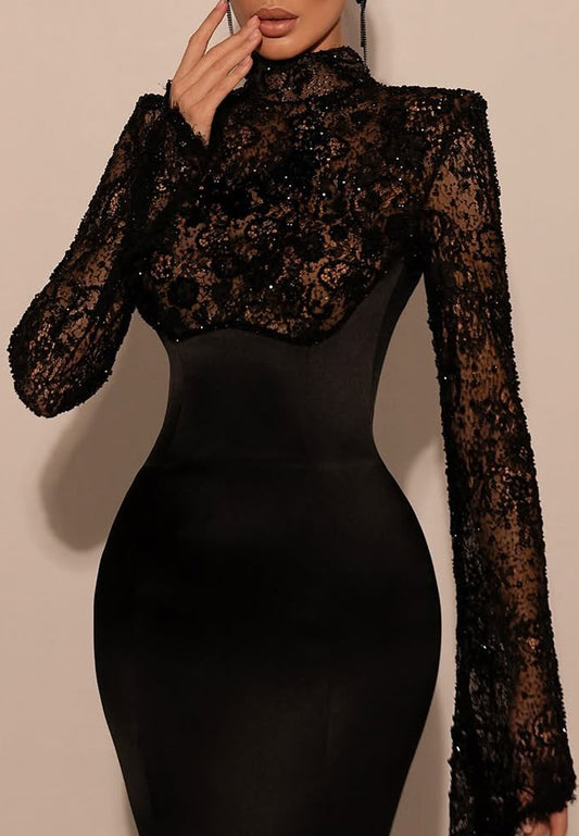 High Neck Long Sleeves Beaded Embroidery Sparkly Mermaid Evening Dress
