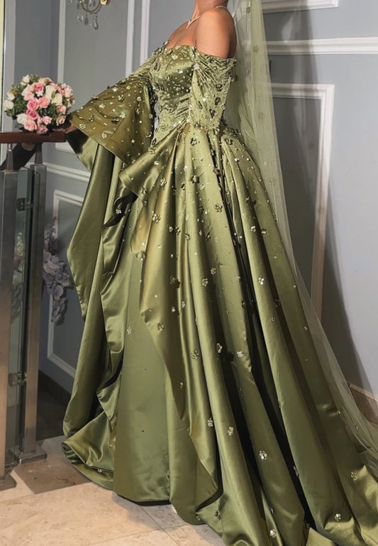 Off-Shoulder Puff Sleeves Beaded Embroidery Mermaiid Evening Dress