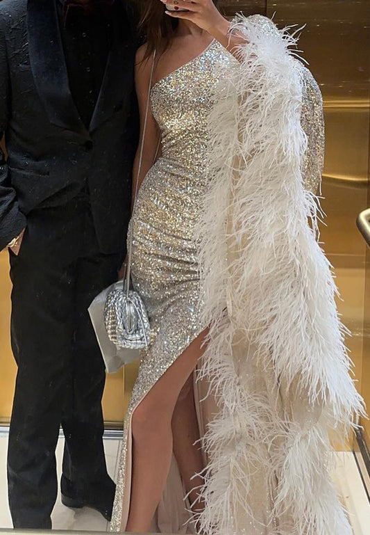 One Shoulder Long Sleeves Sequins Feathered Sheath Evening Dress