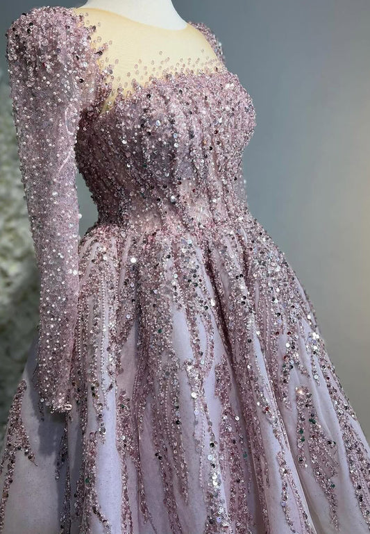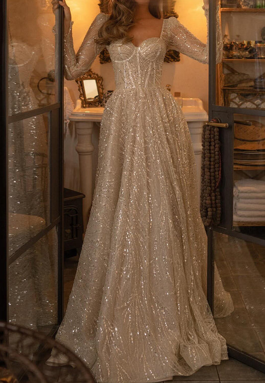 Sweetheart Long Sleeves Beaded Embroidery Sparkly A-Line Prom Dress