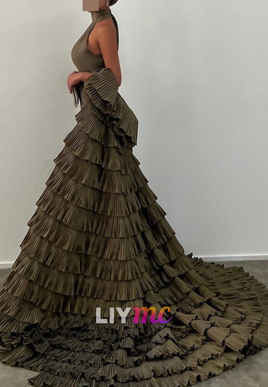 Halter V-Neck Sleeveless Pleated A-Line Evening Dress