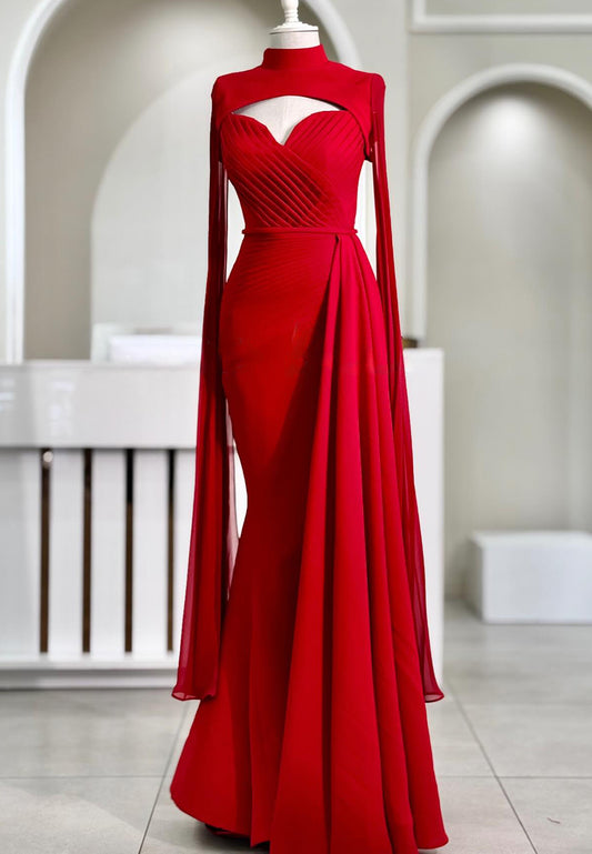 High Neck Long Sleeves Pleated Mermaid Formal Dress