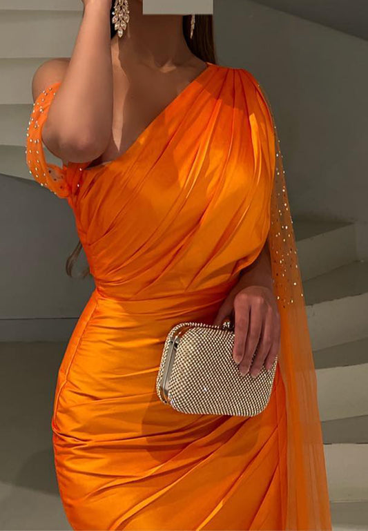 One Shoulder Sleeveless Beaded Pleated Mermaid Formal Dress