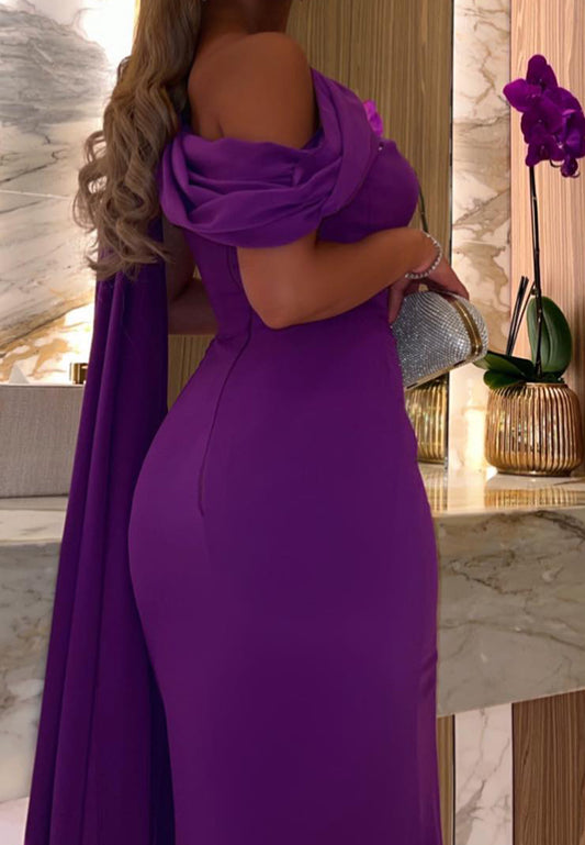 Evening Off-Shoulder Dress Pearl Trim Draped Design Dress