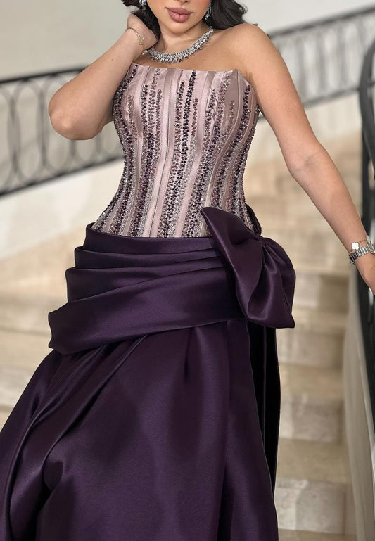 Off-Shoulder Beaded Ruched Bowknot Satin A-Line Evening Dress