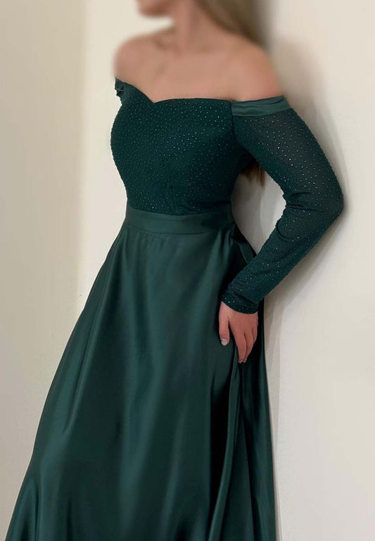 Off-Shoulder Long Sleeves Beaded Pleated Satin A-Line Formal Dress