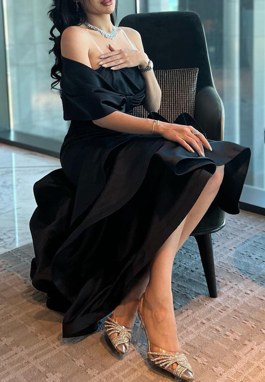 Off-Shoulder Spaghetti Straps Pleatedd Satin A-Line Formal Dress
