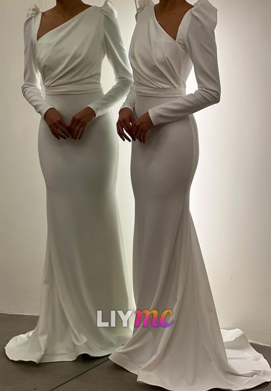 LP2269 - Asymmetrical Long Sleeves Ruched Sleek Satin Sheath Prom Dress