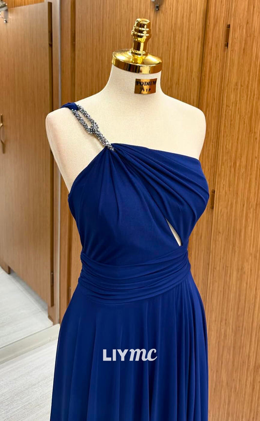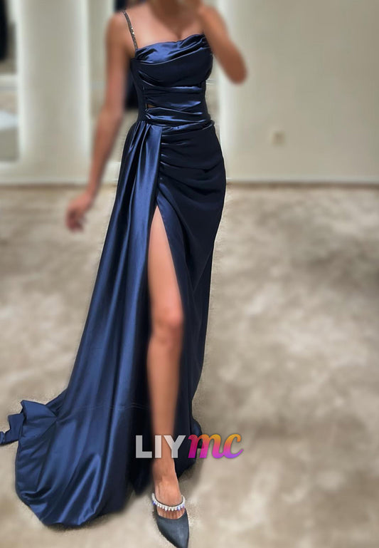 LP2263 - Asymmetrical Straps Pleated High Slit A-Line Prom Dress