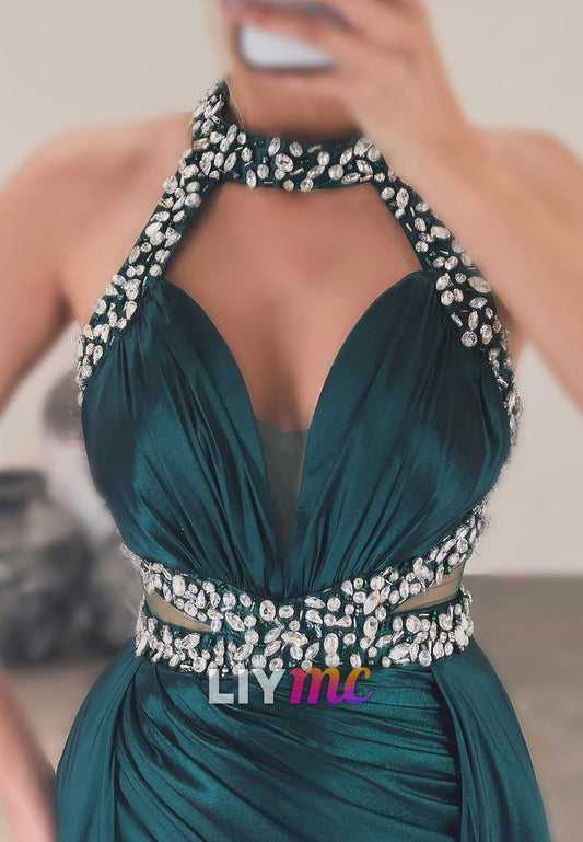 LP2267 - Halter Beaded V-Neck Sleeveless Pleated Sheath High Slit Prom Dress