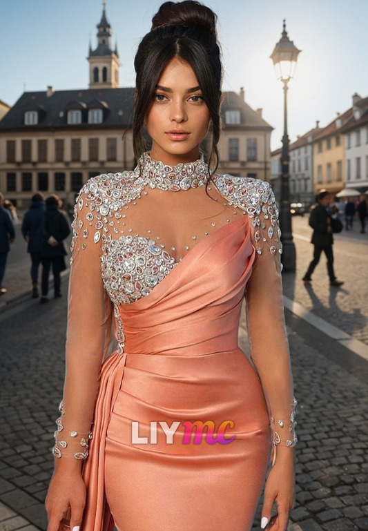 LP2315 - Halter Sheer Sleeves Beaded Sleek Satin Mermaid Prom Dress