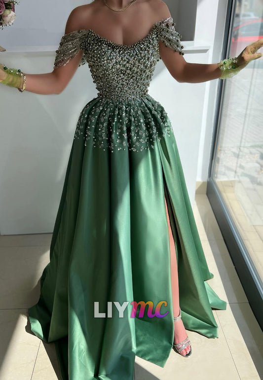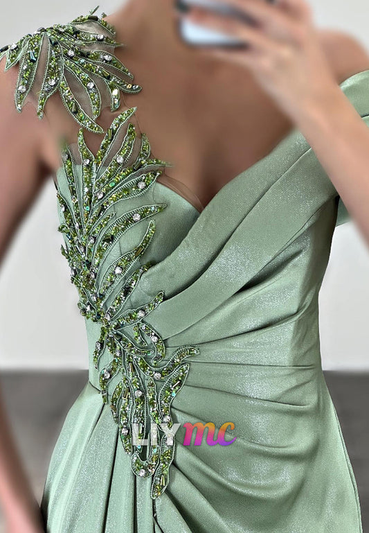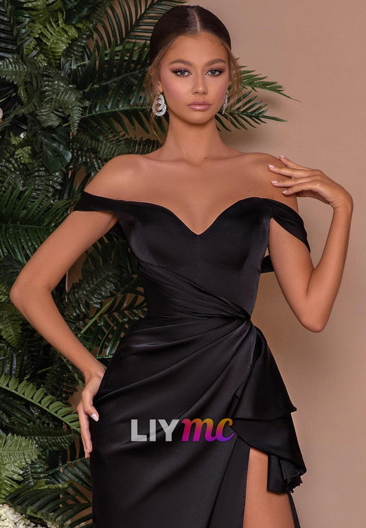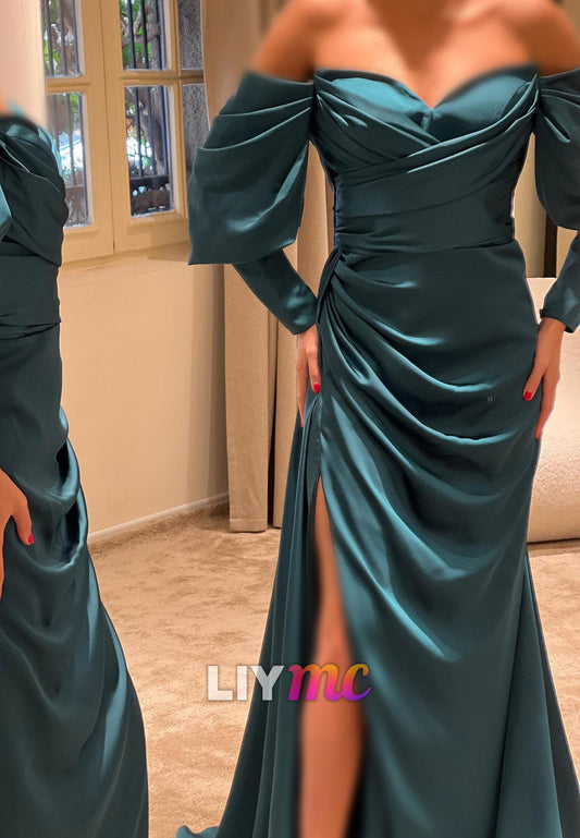 LP2306 - Off-Shoulder Pleated High Slit Sleek Satin Sheath Prom Dress