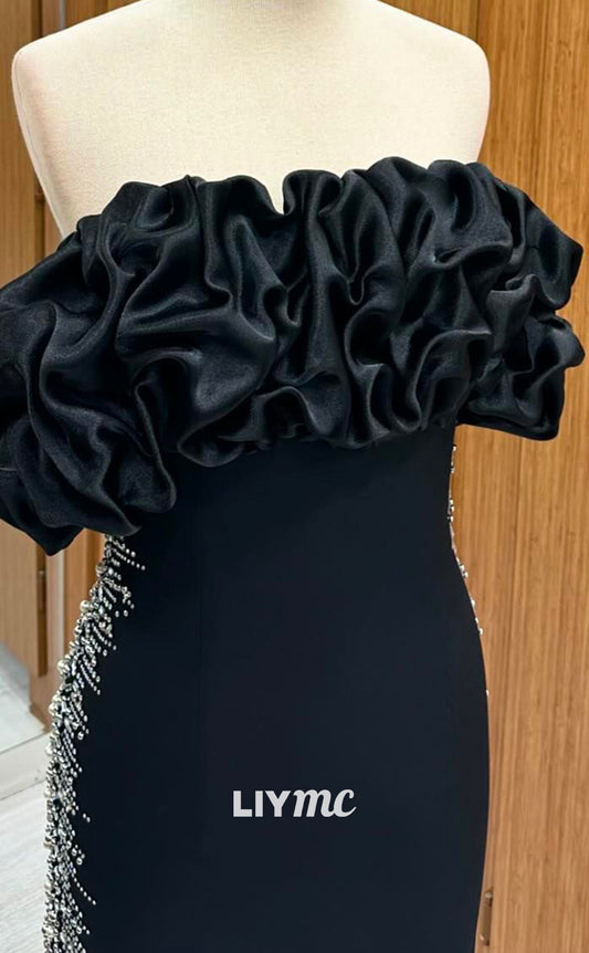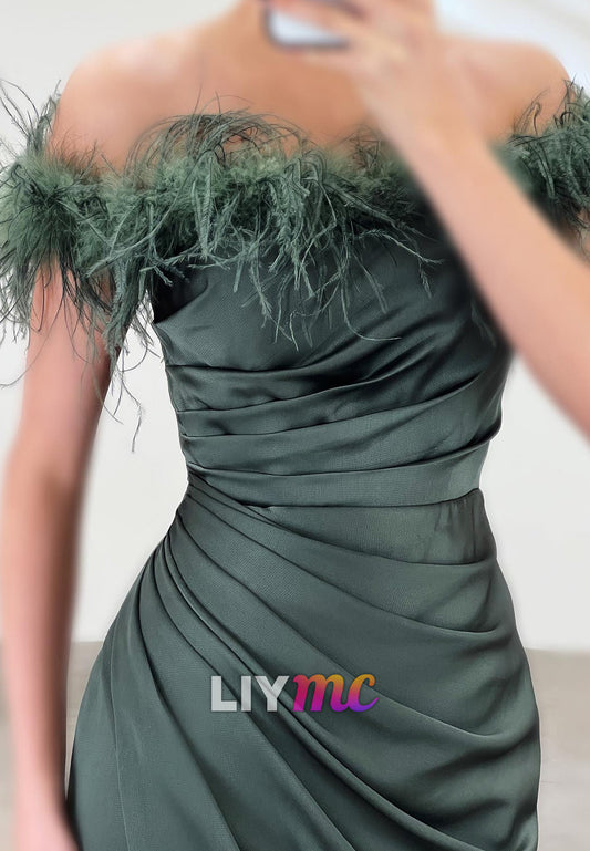 LP2266 - Off-Shoulder Strapless Pleated Feathered Side Slit Sheath Prom Dress