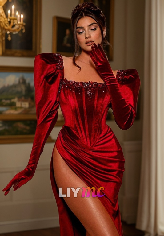 LP2312 - Square Long Sleeves Ruched High Slit Prom Dress