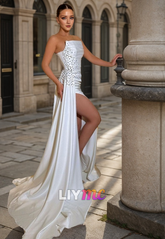 LP2294 - Off-Shoulder Strapless Pleated A-Line High Slit Prom Dress